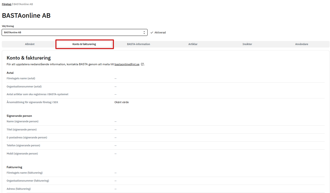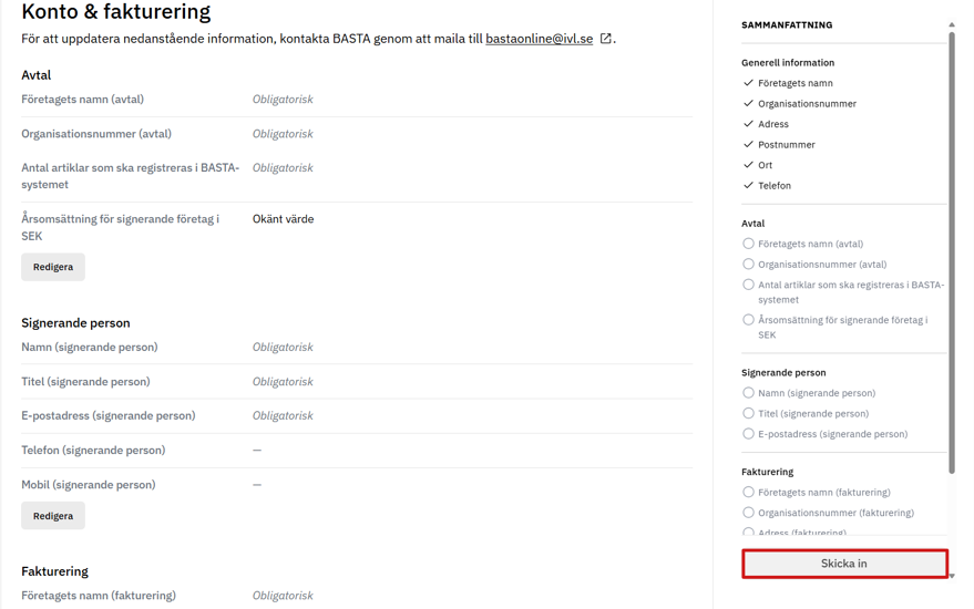 För att underlätta denna process kan man i högermenyn följa vilken information som saknas för att kunna skicka in registreringen. När all information är ifylld kommer BASTA att skicka ut ett digitalt avtal för signering. När avtalet är signerat aktiveras företaget och man kan börja registrera artiklar.