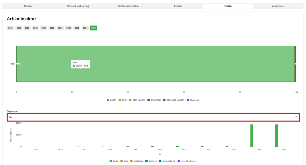 - Förbättring av fliken insikter. Nu kan man välja mellan olika typer av diagram för att kunna titta på den data man har om sina registrerade artiklar.