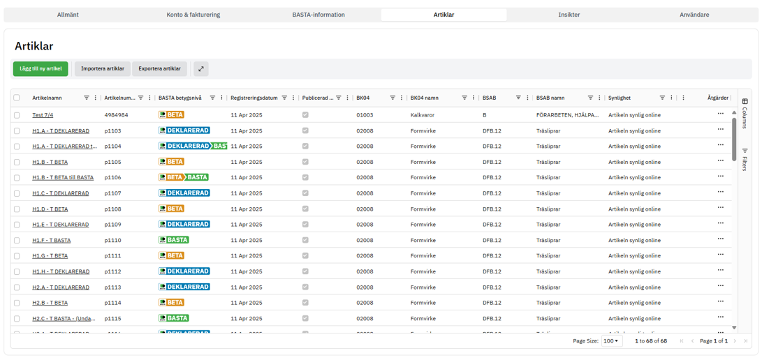 - Utökade möjligheter att filtrera och få fram registrerade artiklar, samt enklare administrering av dem. Alla registrerade artiklar kommer att finnas i en dynamisk vy och du kan själv byta ordningen på kolumner. Samt sortera och filtrera fram produkter som du vill uppdatera eller granska.