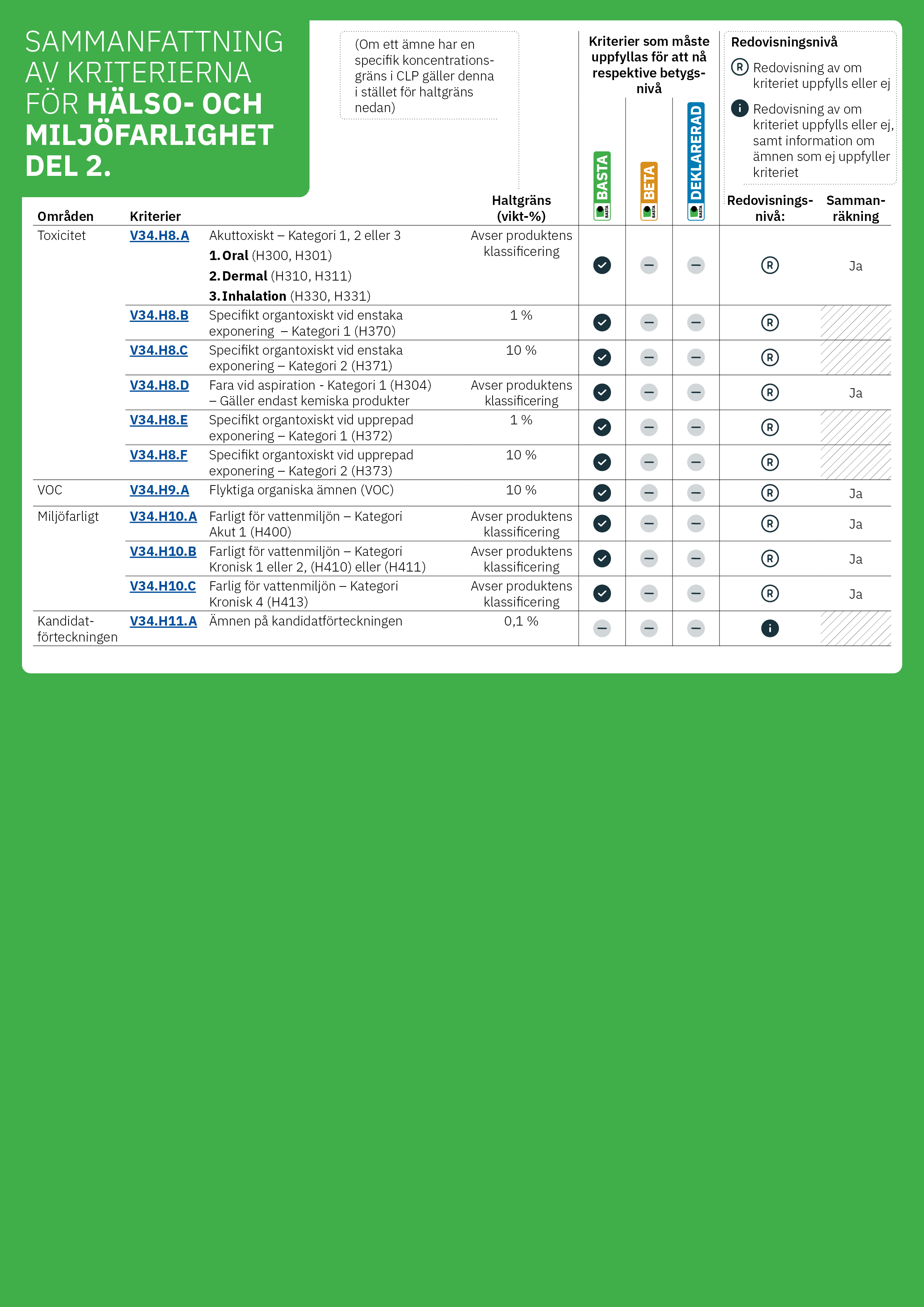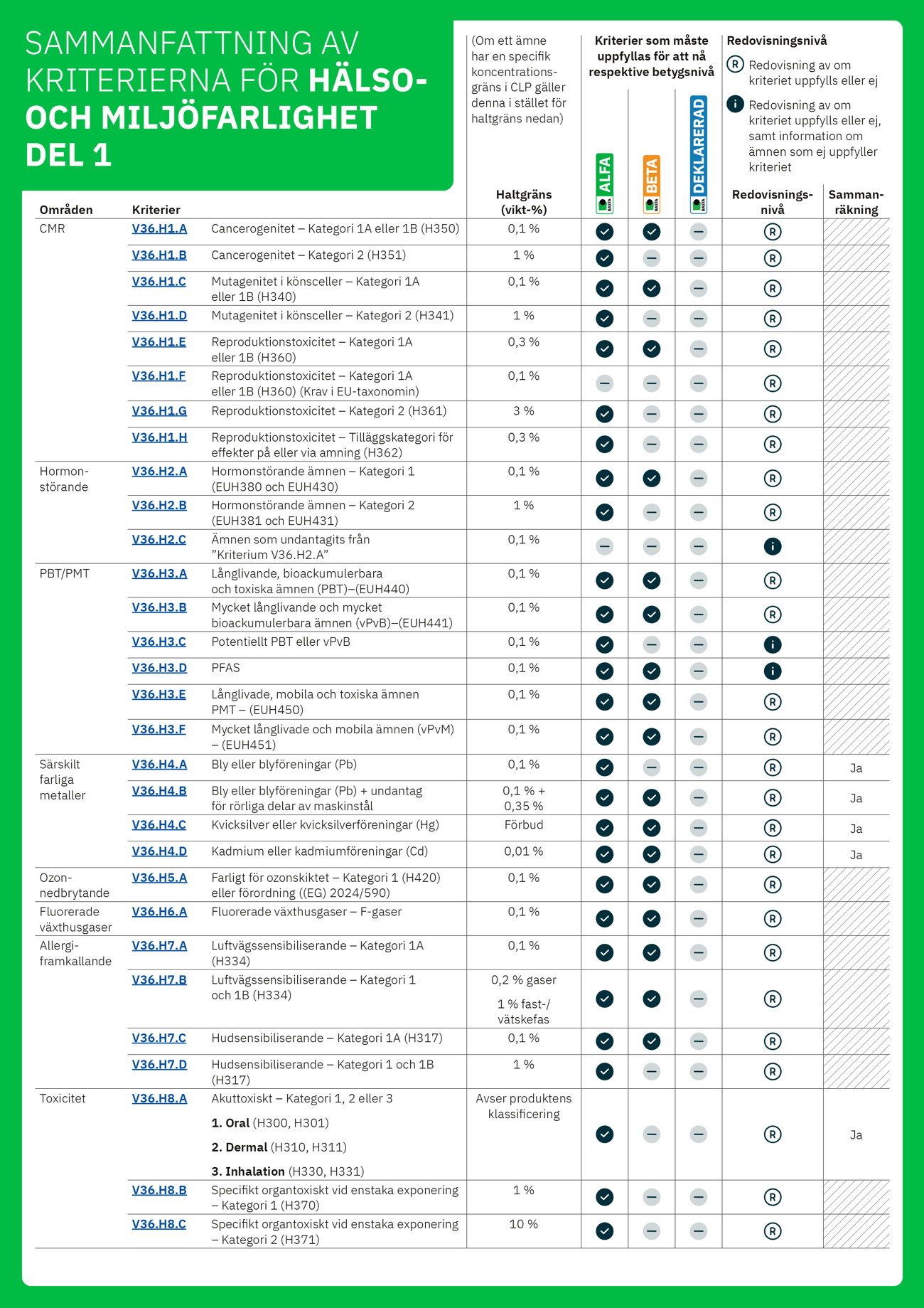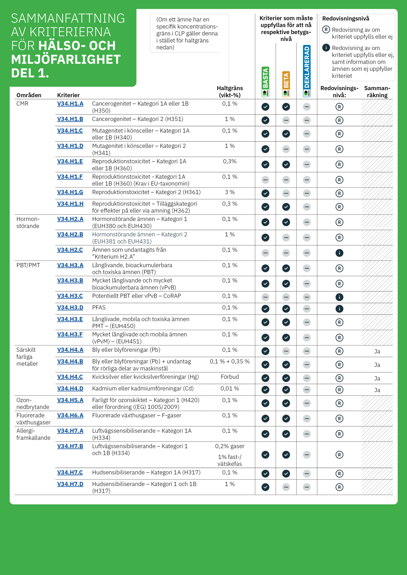För bedömningar inom kriterieområdet Hälso- och miljöfarlighet ska även följande uppfyllas:
