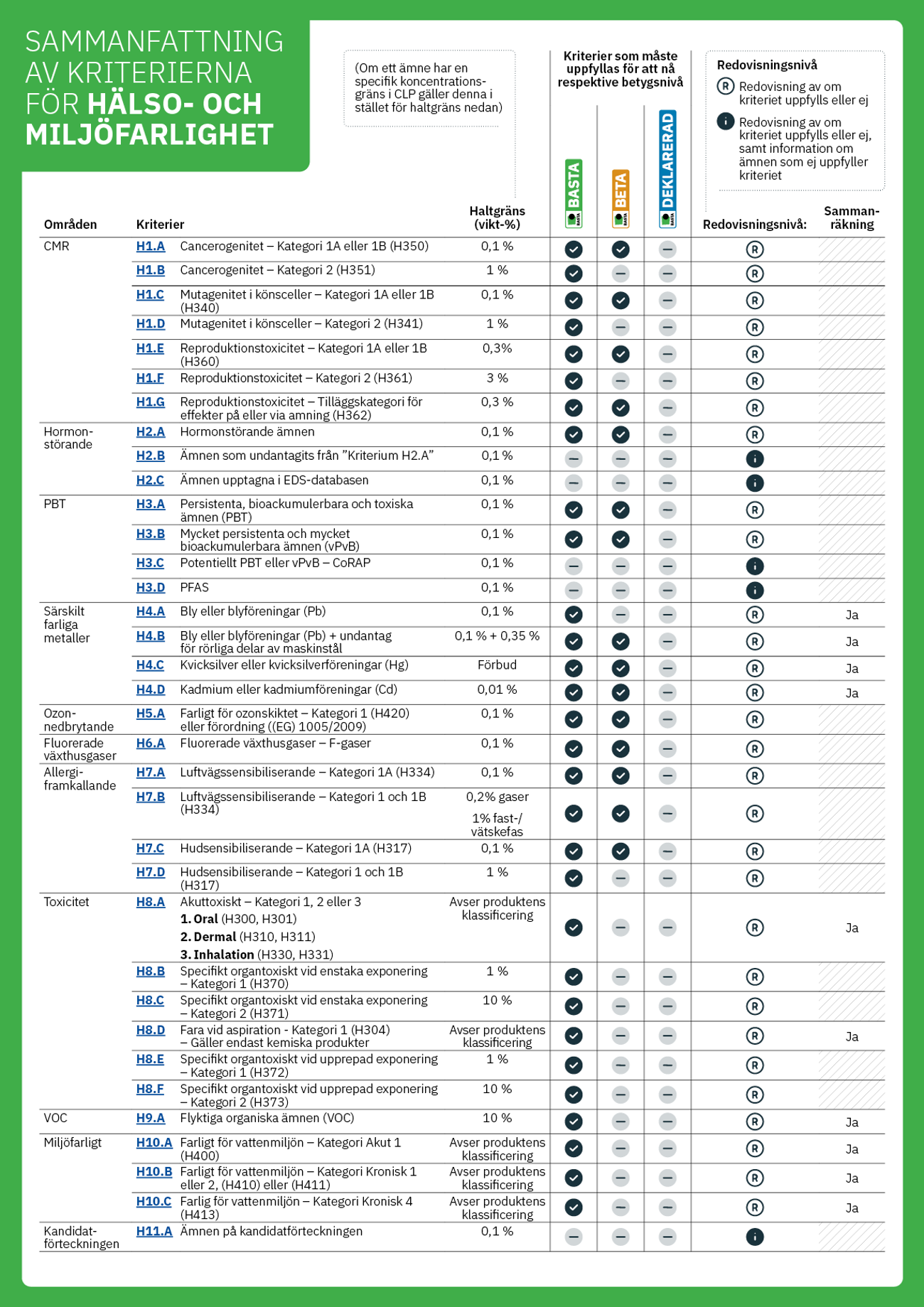 Alla kriterier redovisas i sin helhet i BASTA-systemets kriteriedokumentet som finns att ladda ned från sidan dokument.