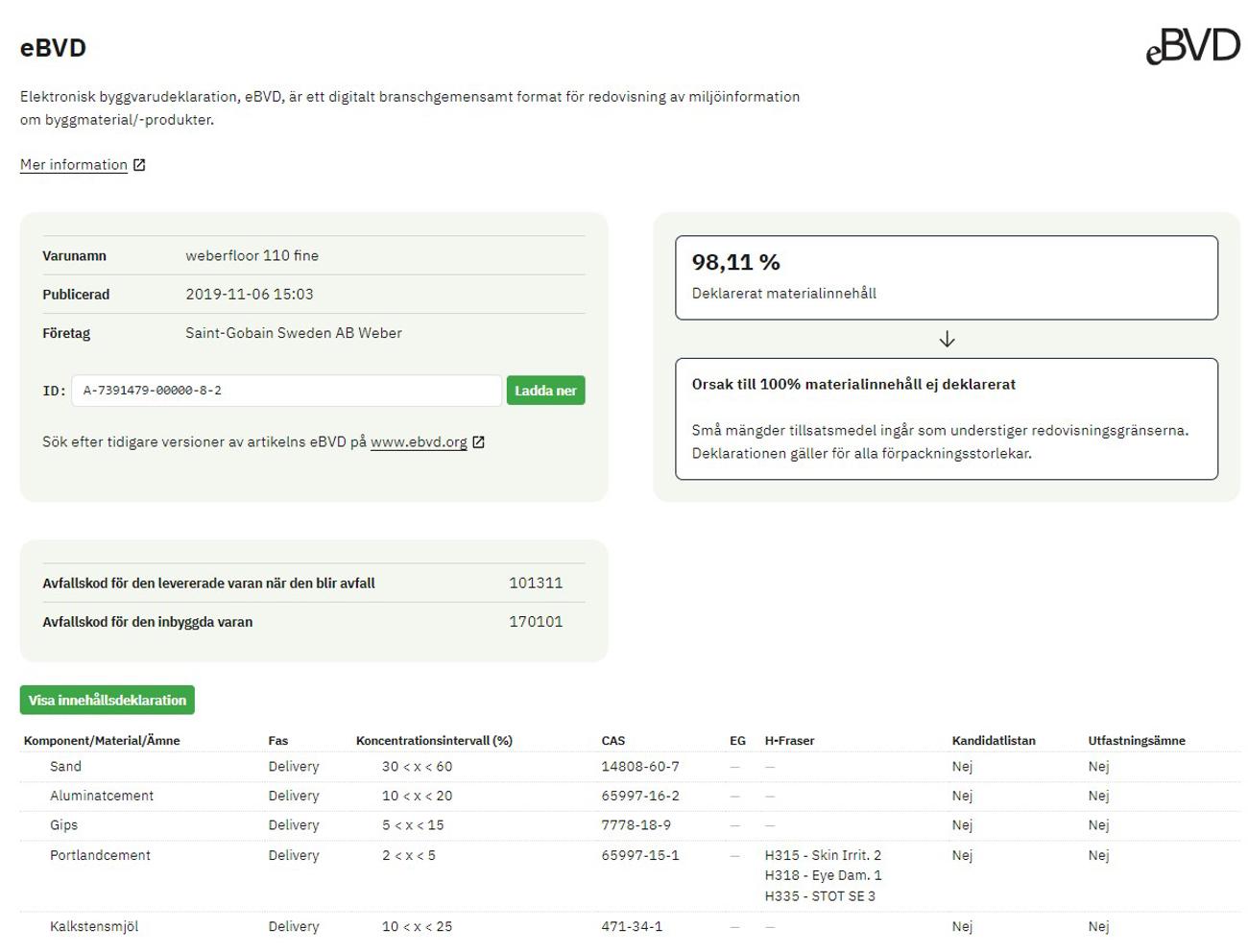 Om man klickar på "Visa innehållsdeklaration" så kommer produktens sammansättning enligt eBVDn att visas. I den kan man bland annat se komponent, material och ämnen tillsammans med deras koncentrationsintervall, CAS-nummer och H-Fraser.