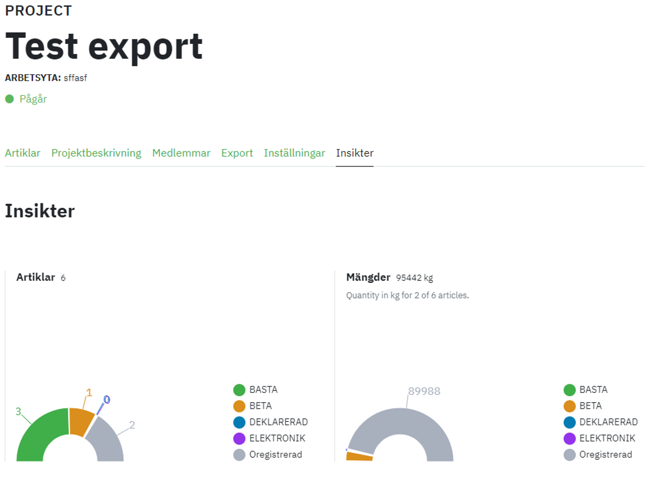 På varje projekt sammanställs grundläggande statistik över tillagda produkter. Här kan man se saker som indelning mellan betyg, vikter, mm.