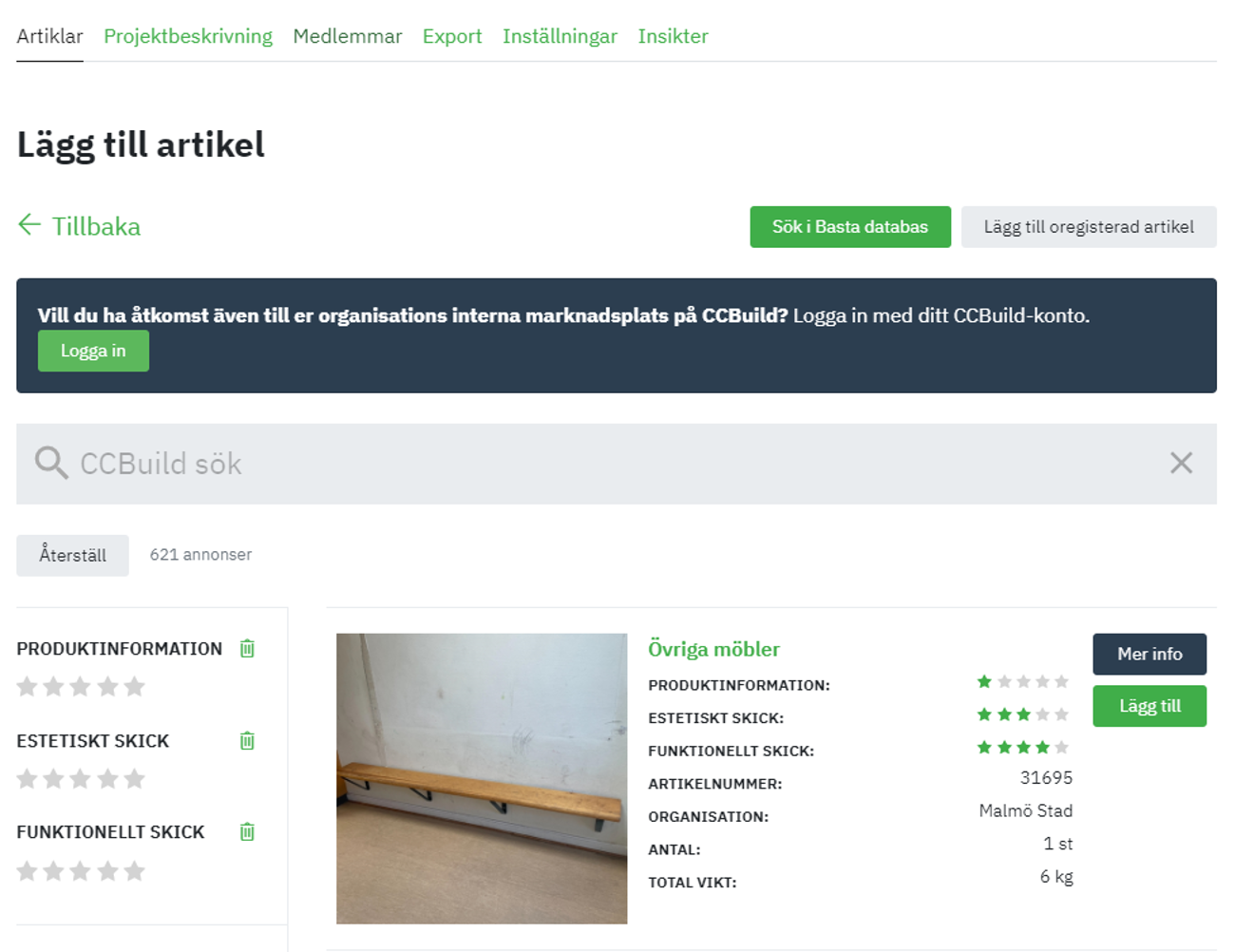 När du letar efter produkter att lägga till så kan du även söka i CCBuilds marknadsplats för att hitta återbrukade produkter. Om du har ett konto där kan du även logga in och söka i din organisations interna marknadsplats.