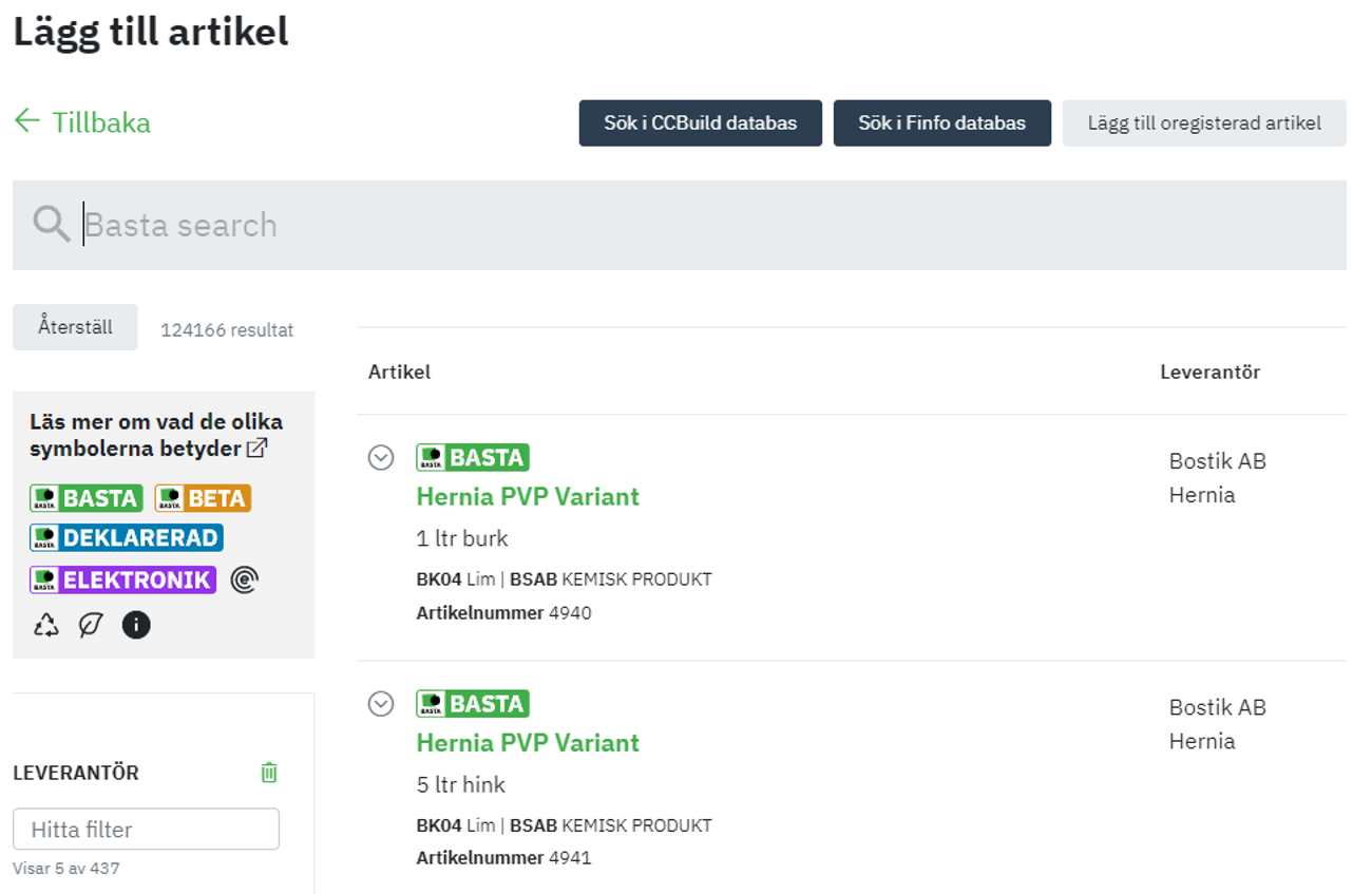 Om du inte hittar den produkten du söker i BASTAs databas kan du istället söka i FINFOs databas. Dessa produkter är inte miljövärderade av BASTA men genom att lägga till dem denna väg får du mer grundläggande produktinformation utan att behöva mata in information manuellt.