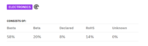 The methodology is based on the manufacturer stating the proportion of the product’s total weight that meets BASTAs different requirement level. The qualification starts with the highest requirements (Basta) where the total proportion (weight%) that passes that level is stated. Then it works its way down into the structure until the total weight of the product is distributed. The different levels referred to are Basta -Beta -Declared – RoHS -Unknown.