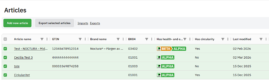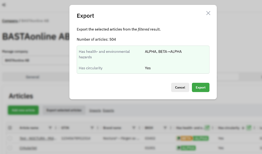 When exporting articles from the logged-in view, you can now choose to export only those articles that match the selected filters. Filters can be applied directly within the columns in the table overview, as well as manually select articles for export.