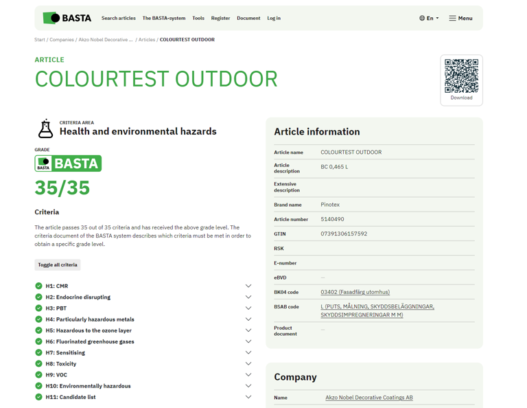 In order to increase the value of a registered article and be able to show what a certain rating level means, each individual article will get its own article page. On this page, we will display information about the article, which grade it has obtained and which criteria that have been met. Information from the optional criteria areas circularity, renewability, environmental effects as well as emissions and tests will also be displayed.
