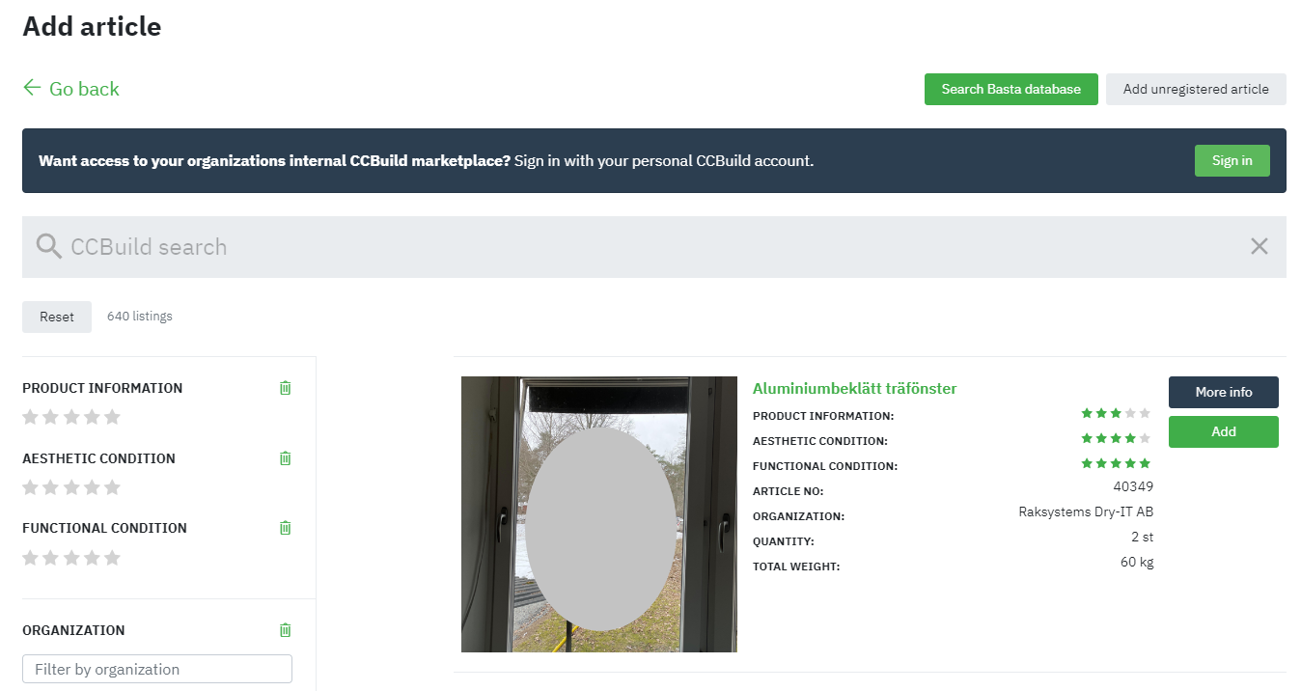When looking for products to add, you can also search CCBuild's marketplace to find recycled products. if you have an account there, you can also log in and search your organization's internal marketplace.