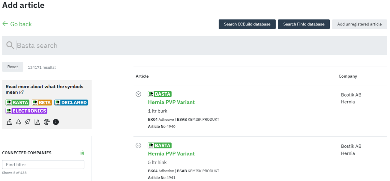 If you cannot find the product you are looking for in BASTA's database, you can instead search in FINFO's database. These products are not environmentally assessed by BASTA but by adding them this way you get more basic product information without having to enter information manually.