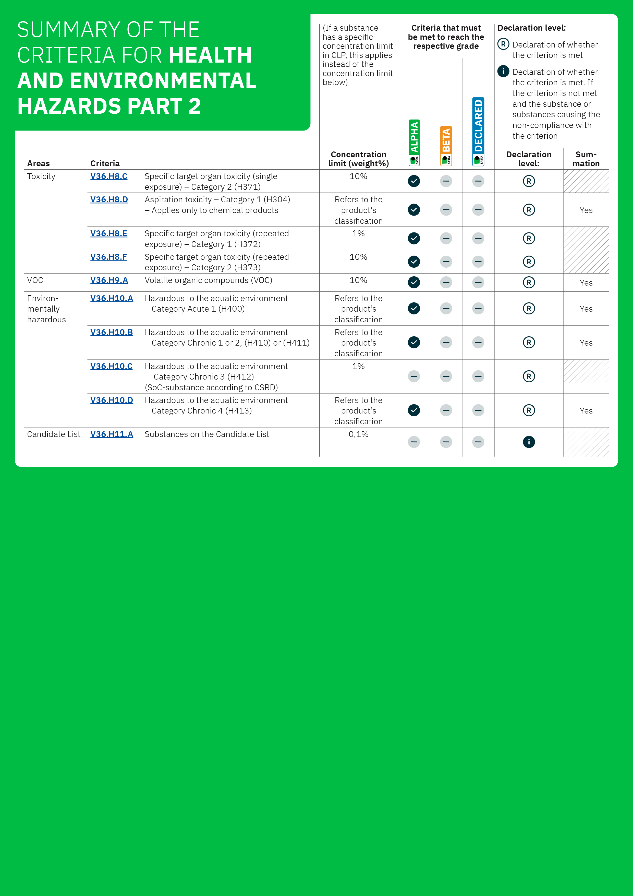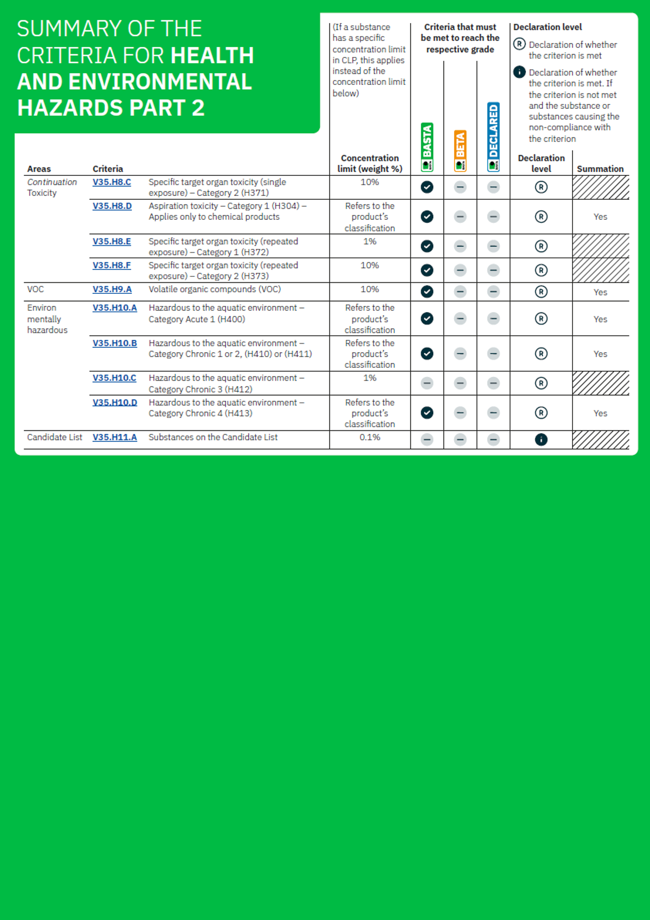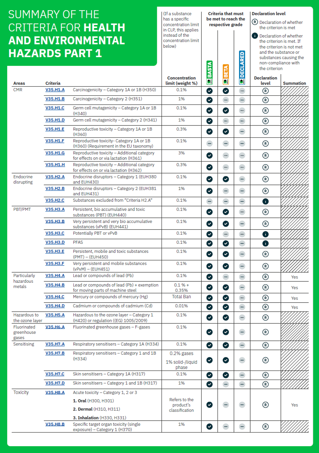 When registering a product in the BASTA system, it is mandatory to assess and declare which of the criteria are met and which are not. Depending on the criteria met in this criteria area, the registered product receives a specific grade.
