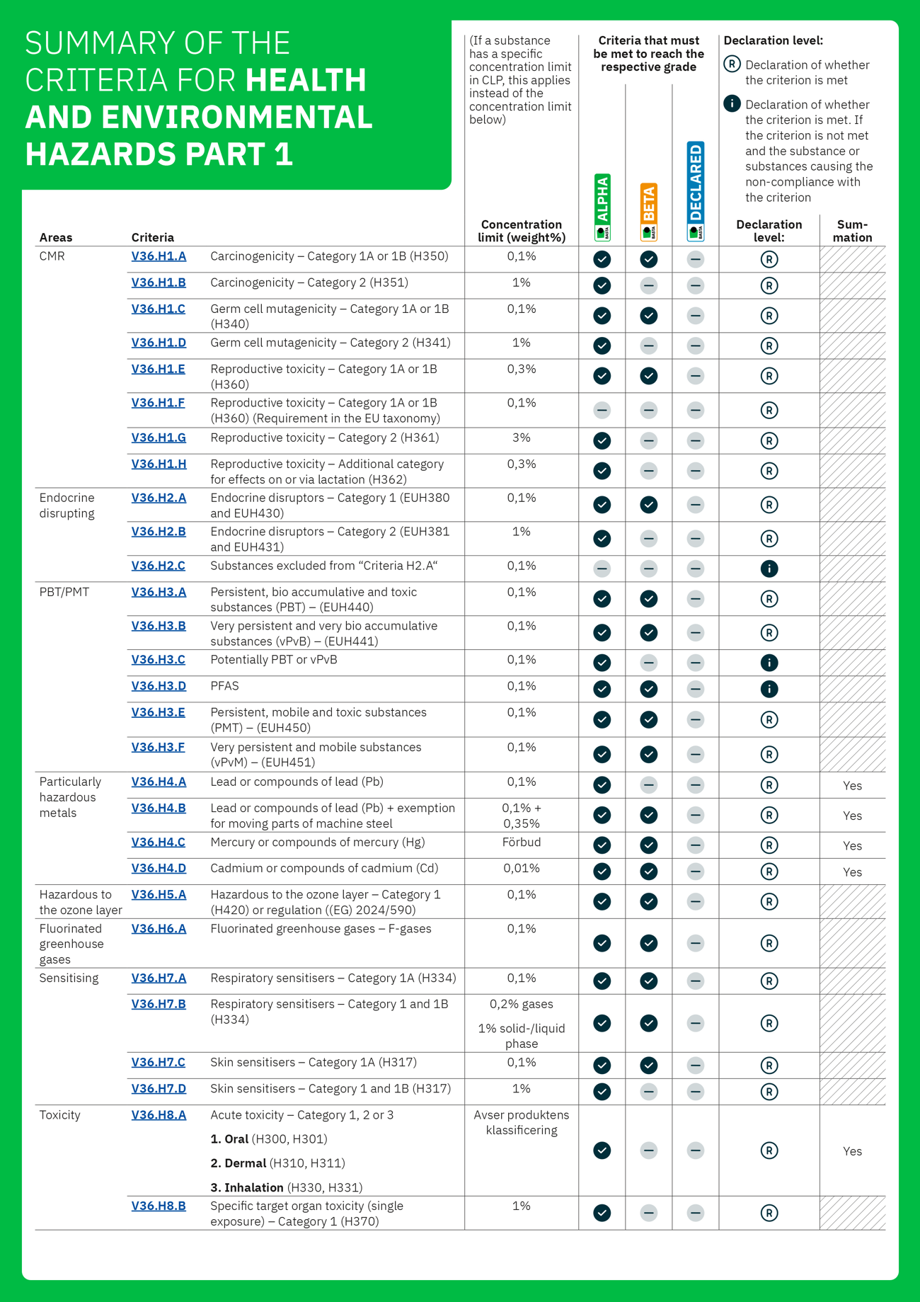 This criteria area is the basis of the BASTA system and limits substances with different health and environmentally hazardous properties. The criteria area comprises 39 criteria which are divided into 11 areas.