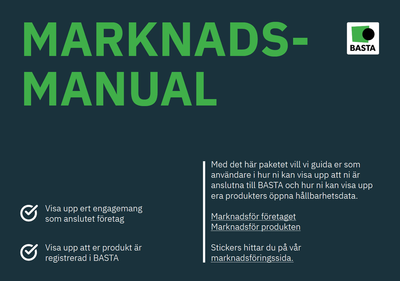 I våra marknadsmanual hittar du information och inspiration om hur du kan marknadsföra att ditt företag är anslutet till BASTA systemet samt dina registrerade produkter. I våra grafiska riktlinjer hittar du information om hur du får använda loggor och vilka färger som ska användas