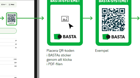 För att visa upp ert engagemang och att ert företag är anslutet till BASTA-systemet kan du använda våra färdiga mallar för stickers. QR-koden leder läsaren till företagssidan här på BASTA:s webbplats.