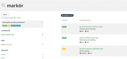 Det nya systemet möjliggör kombinerade sökningar där man genom en knapptryckning låser önskade områden. I exemplet är Spray Master AB låst, vilket man kan se i den blå rutan i sökningens övre del och att företaget är markerat med fetstil i menyn till vänster. Dessutom visas tydligare vilka dokument som finns bilagda till produkten.