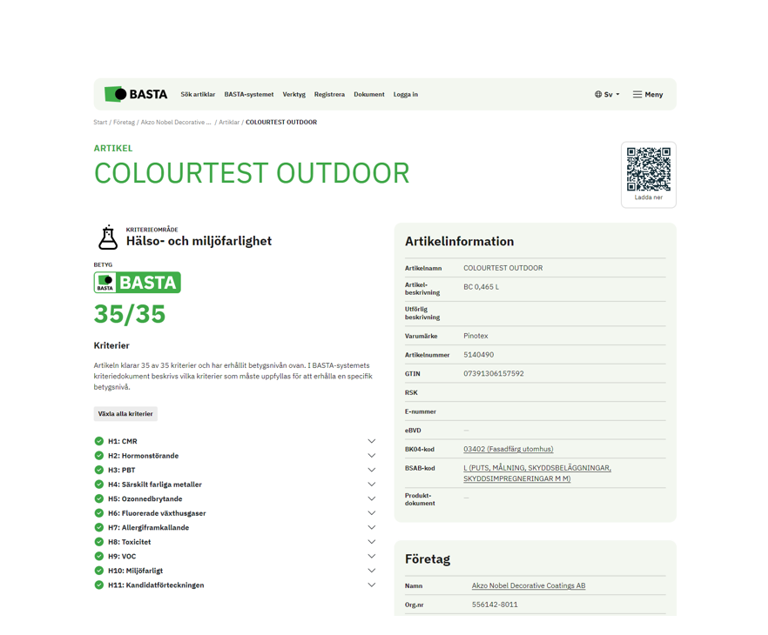 Via vår databas kan du söka efter samtliga artiklar inlagda i BASTA-systemet. Varje enskild artikel kan sedan öppnas i en egen sida där mer information om den specifika artikeln visas, till exempel information om vilket betyg som erhållits och vilka kriterier som uppfylls. Även information från de valbara kriterieområdena cirkularitet, förnybarhet, miljöeffekter samt emissioner och tester visas på artikelsidan.