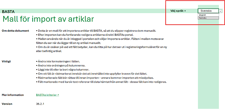 Importfilen för att lägga till och/eller uppdatera artiklar i BASTA har förenklats genom att samla både den engelska och svenska versionen i en och samma Excel-fil.