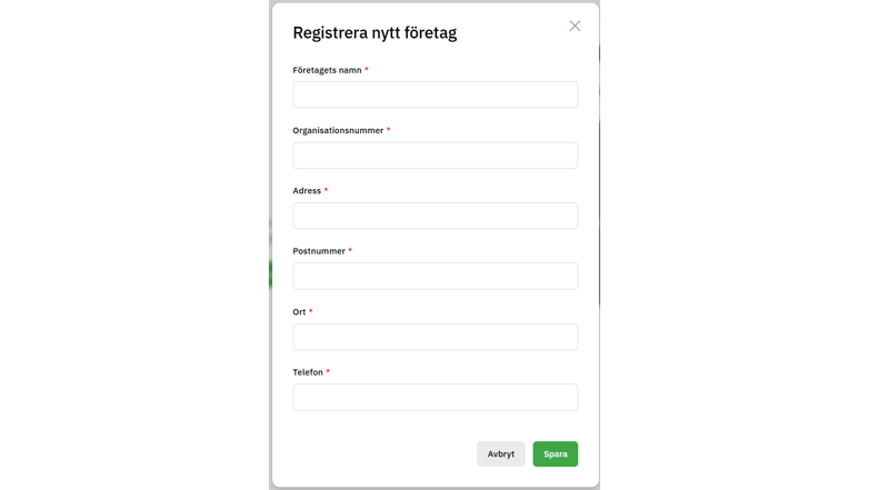 1) När man loggat in klickar man på ”Registrera nytt företag” och anger grundläggande information. Då skapas ett företag.