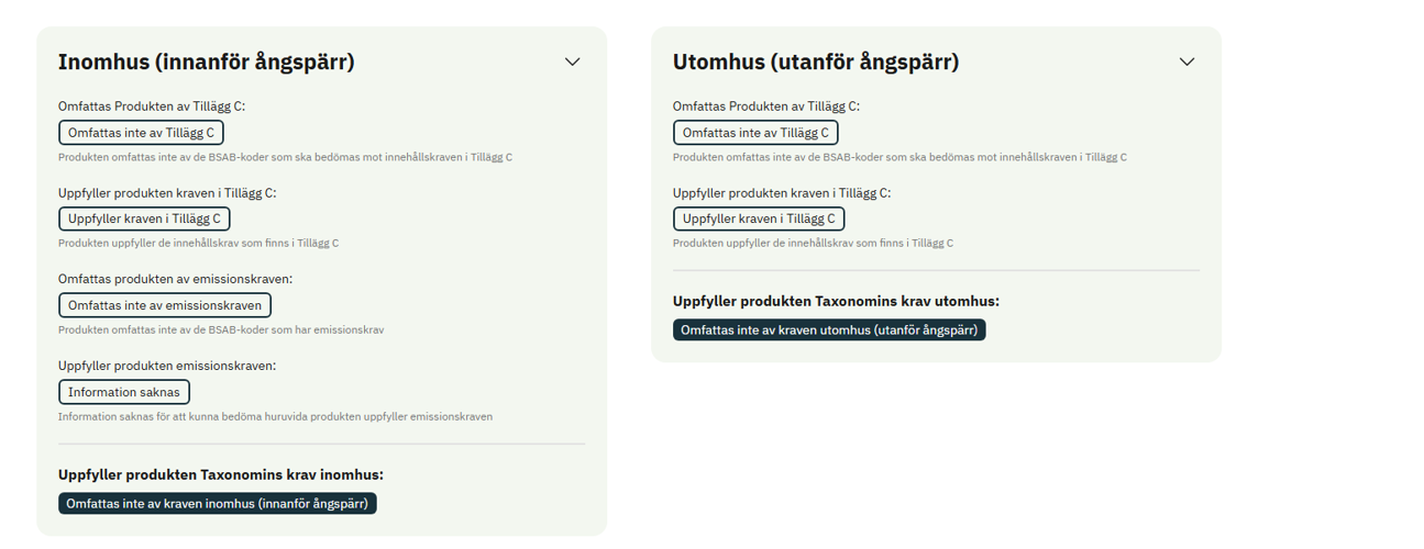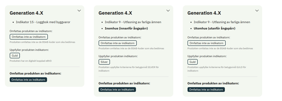 För Miljöbyggnad har ett liknande arbete gjorts och vi har där lagt till information om produkten omfattas av kraven eller inte. Och även där visas både om en produkt omfattas av kraven, baserat på dess BSAB-kod, och om den uppfyller kraven. Detta görs för både för loggboks- och utfasningsindikatorn. Se exempel nedan och läs mer på denna sida, Externa kravställare och certifieringar